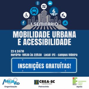 Visando promover uma discussão técnica sobre Mobilidade Urbana, Sistemas de Trânsito, Acessibilidade e Planejamento Integrado, a Associação Regional de Engenheiros e Arquitetos – AREAVID, com apoio do CREA-SC e o Instituto Federal Catarinense – Campus Videira promove nos próximo dias 23 e 24 de outubro, no auditório do IFC, o 1º Seminário de Mobilidade Urbana e Acessibilidade do Município.
